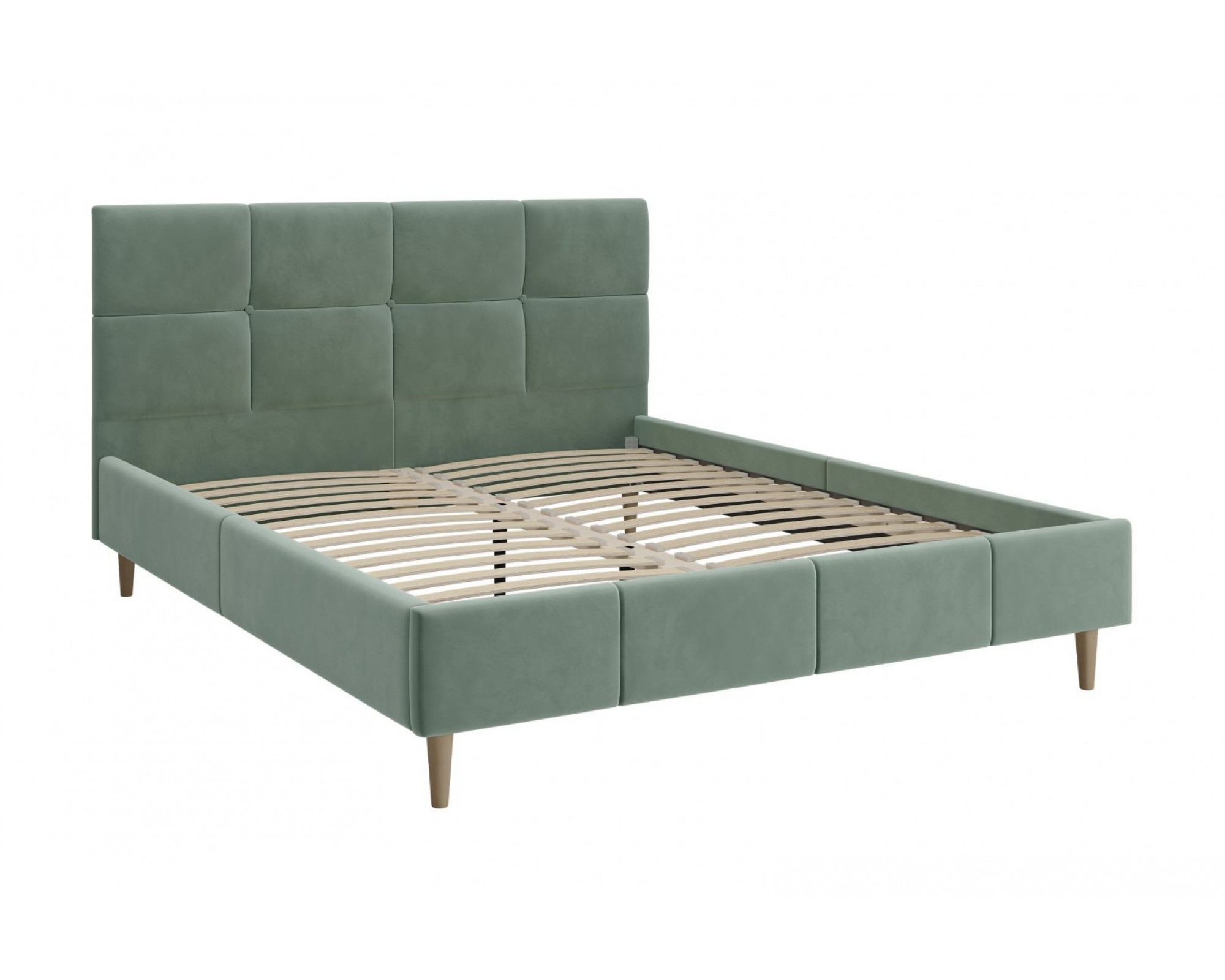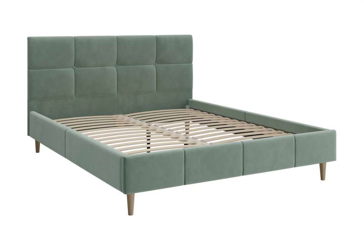 Кровать с мягким изголовьем ХАННА выполнена в стиле минимализм. Головная спинка высотой 103 см имеет лаконичный дизайн с декором в виде утяжки и пуговиц. Визуальной лёгкости модели придают ножки-опоры из массива, которые приподнимают кровать от пола на 14 см, что с функциональной точки зрения очень удобно для уборки под кроватью. Интерьерная кровать Ханна комплектуется ламельным основанием. Двуспальные мягкие кровати ХАННА БРАВО имеют надежный каркас из МДФ, фанеры и ЛДСП. В качестве наполнителя используются различные материалы, такие как холкон, поролон и периотек, которые обеспечивают мягкость, комфорт и долговечность изделия. Внешний слой обивки кровати выполнен из износостойкой качественной ткани в цвете мята.