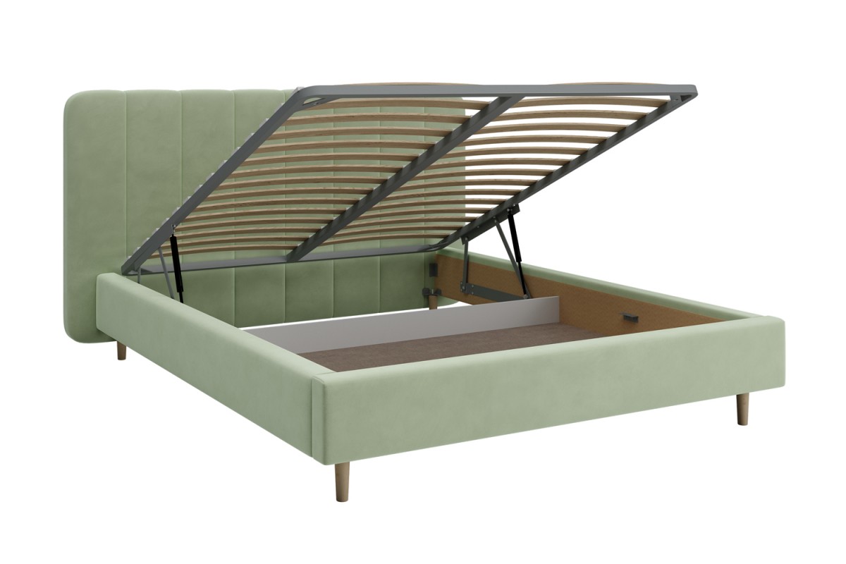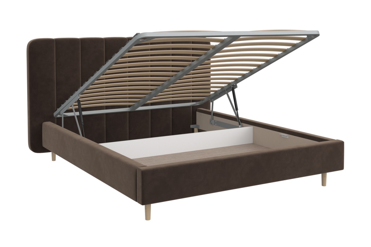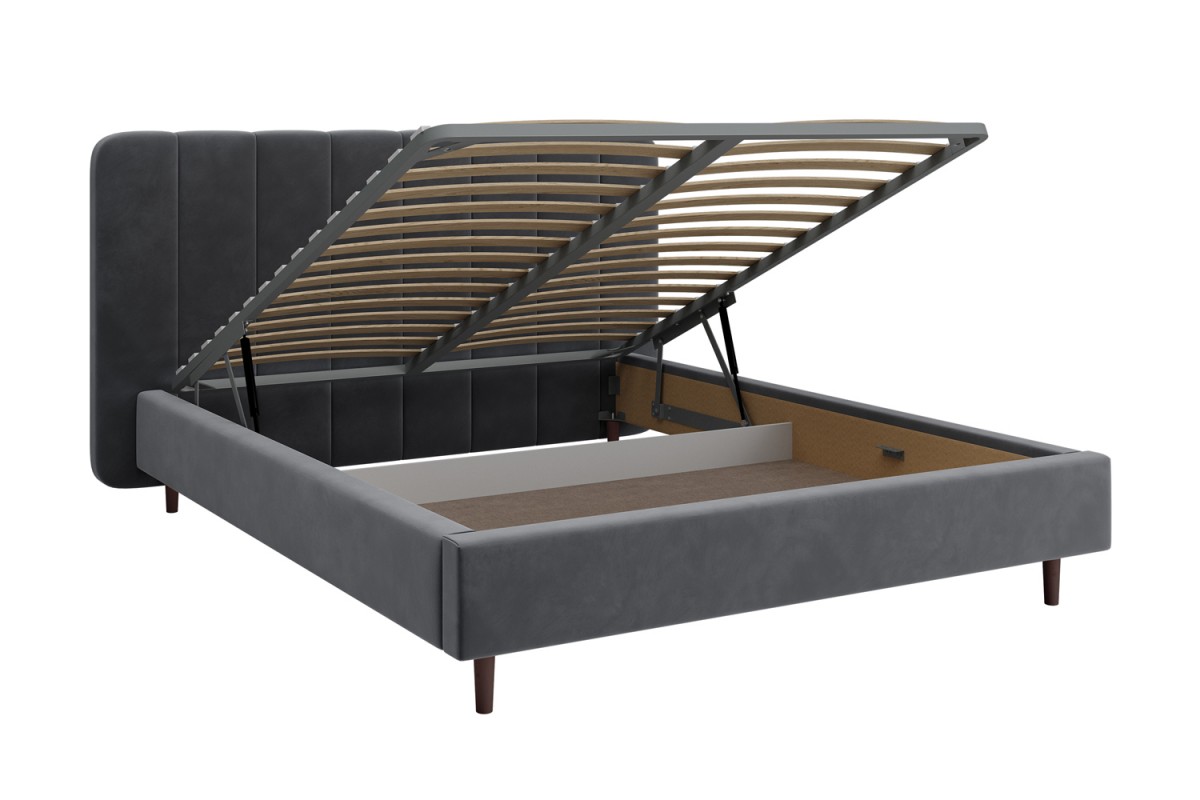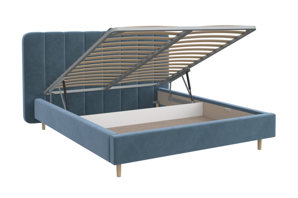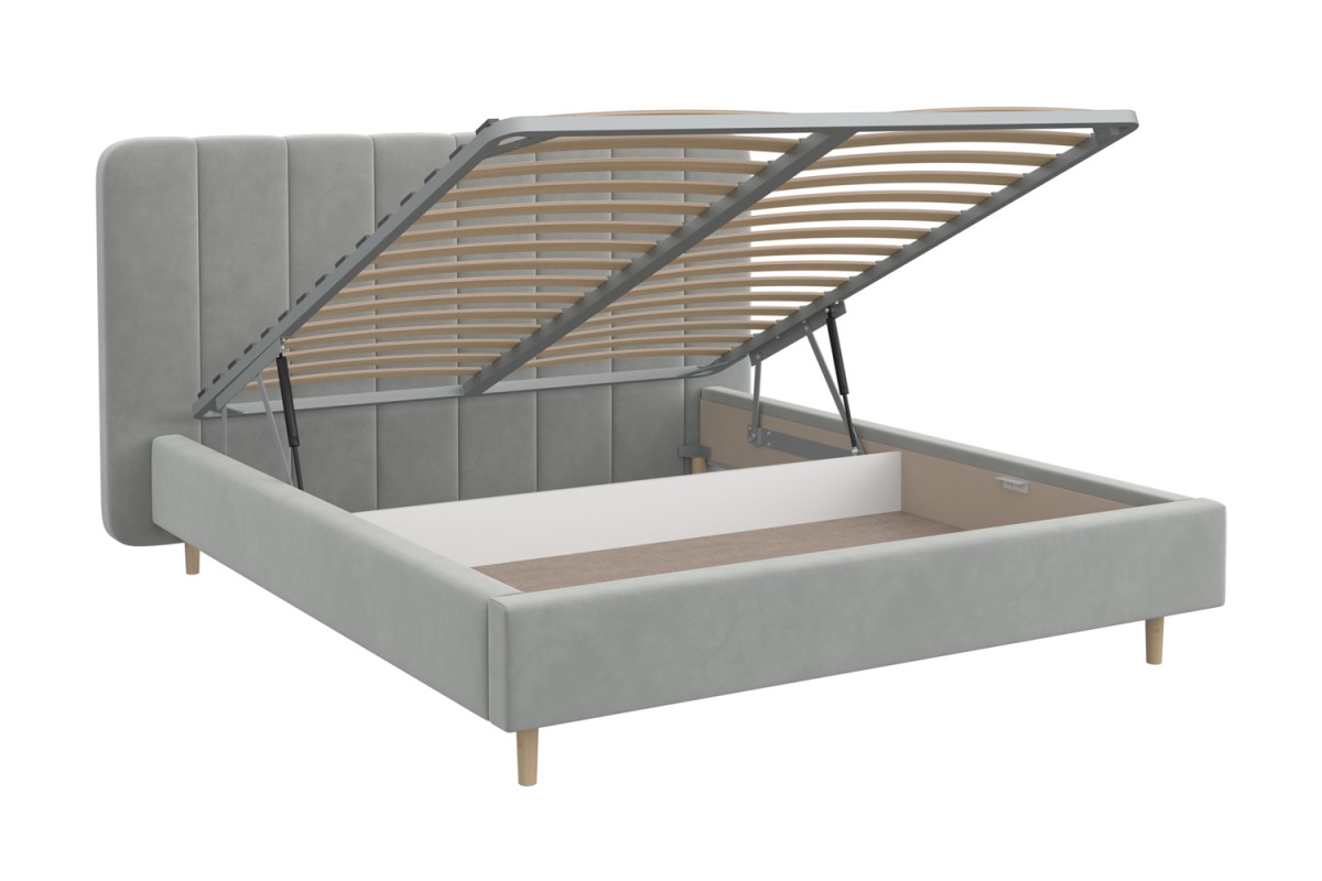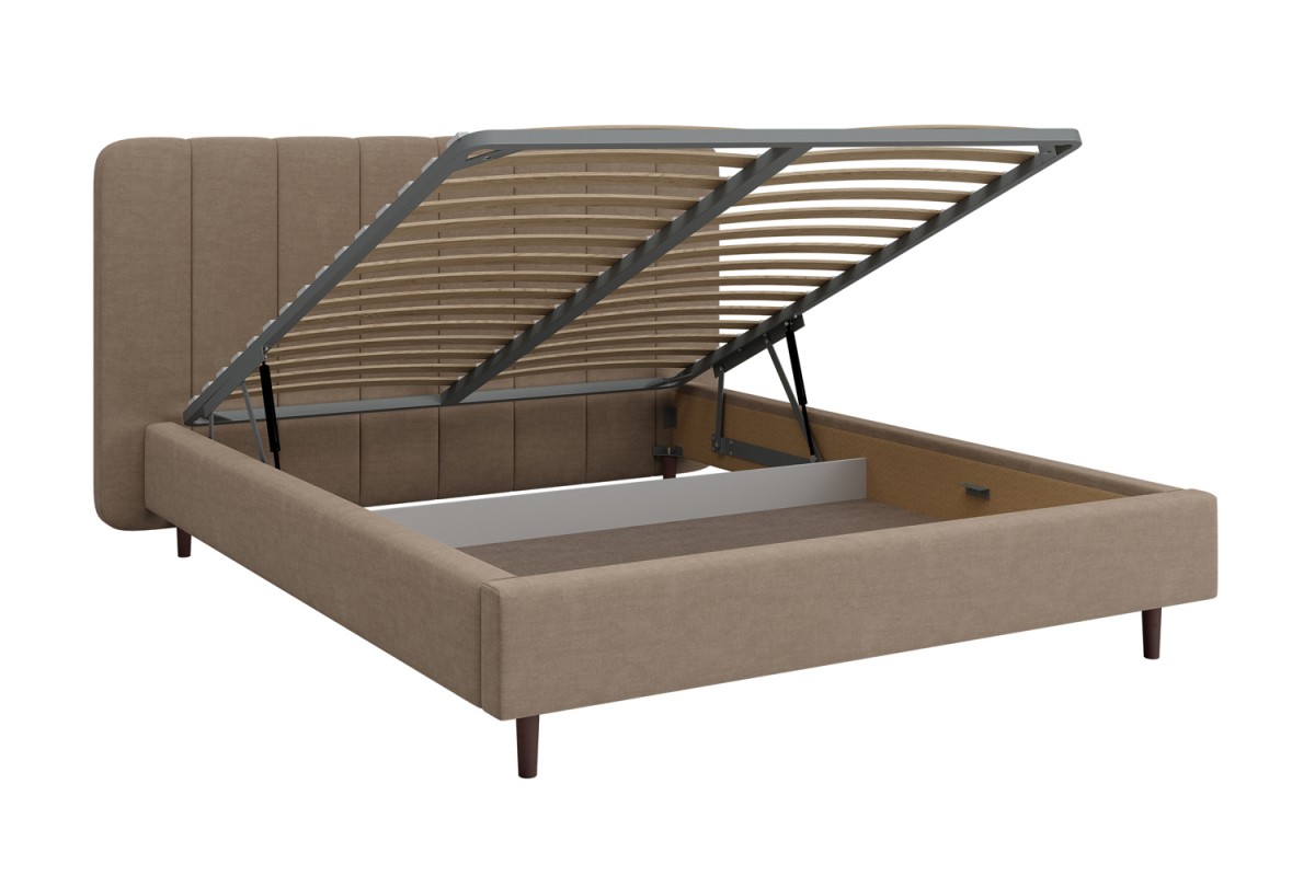 Изголовье кровати РИНО отдекорировано строчками и выходит за боковые габариты кровати, это выглядит очень эффектно и современно. Визуальной лёгкости модели придают ножки-опоры из массива, которые приподнимают кровать от пола на 14 см, что с функциональной точки зрения очень удобно для уборки под кроватью. Кровать может комплектоваться металлокаркасом (вариант 1) или металлокаркасом с подъемным механизмом  (газовым амортизатором (газлифтом)) (вариант 2). В случае выбора 2-го варианта основания спального места в кровати будет находиться бельевой ящик шириной 160 см, длиной 93,5 см и высотой 15 см.