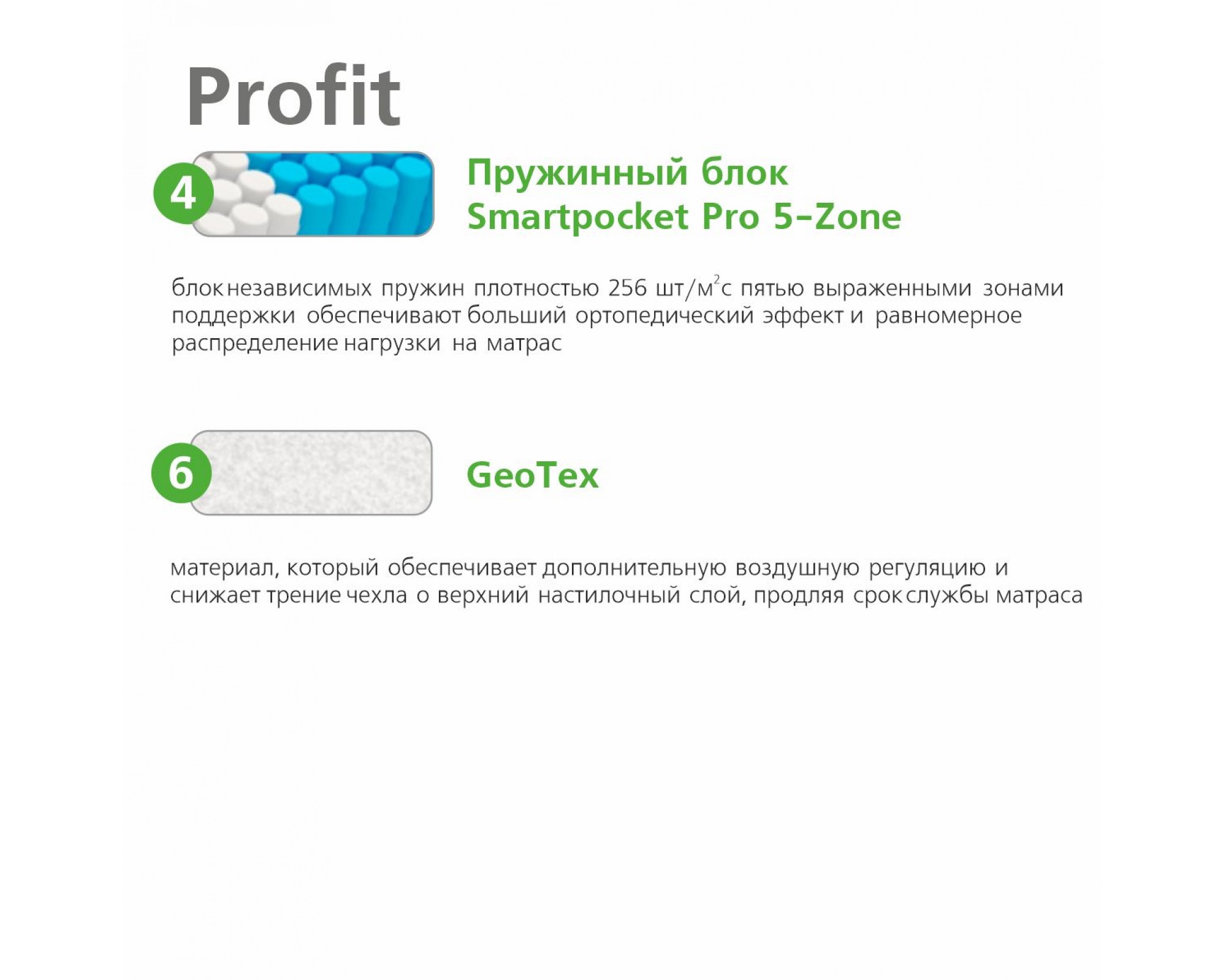 4. Smartpocket Pro 5-Zone: блок независимых пружин плотностью 256 шт/м2. Пять выраженных зон поддержки обеспечивают больший ортопедический эффект, равномерное распределение нагрузки на матрас и дарят комфорт во время сна.