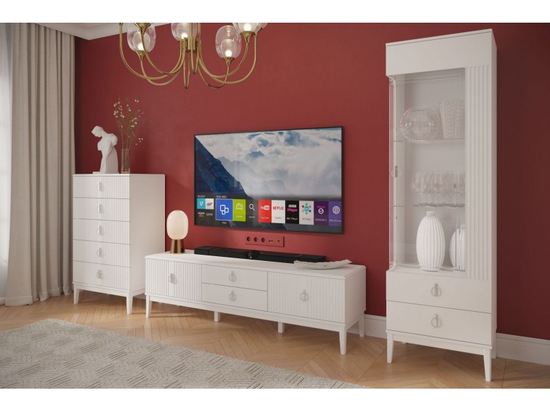 Гостиная ФАРГО (МДФ/полиуретановая эмаль, ЛДСП) в цвете "Белый" с элегантной фрезеровкой фасадов мебели, металлическими ручками, полками из стекла и ножками из массива.