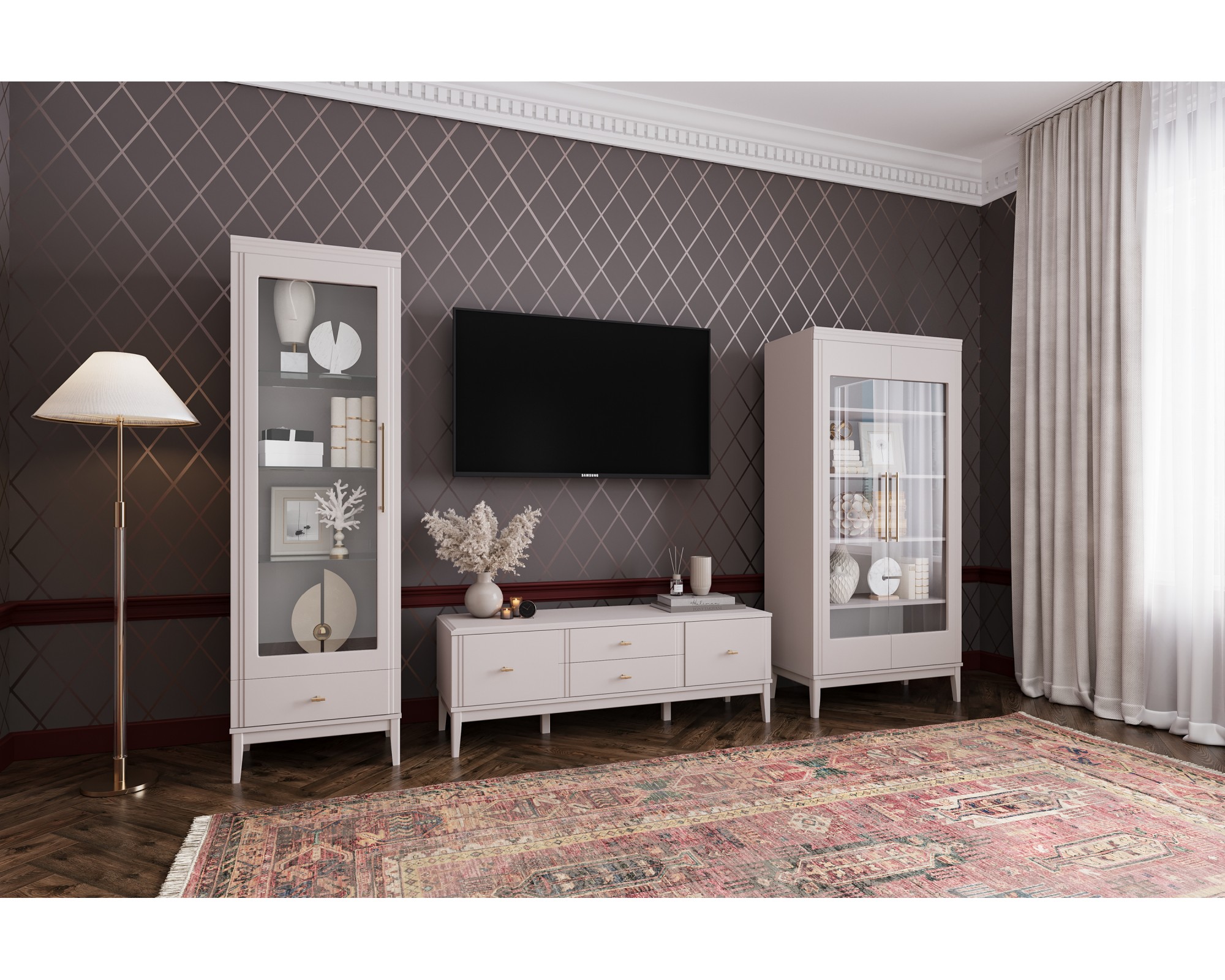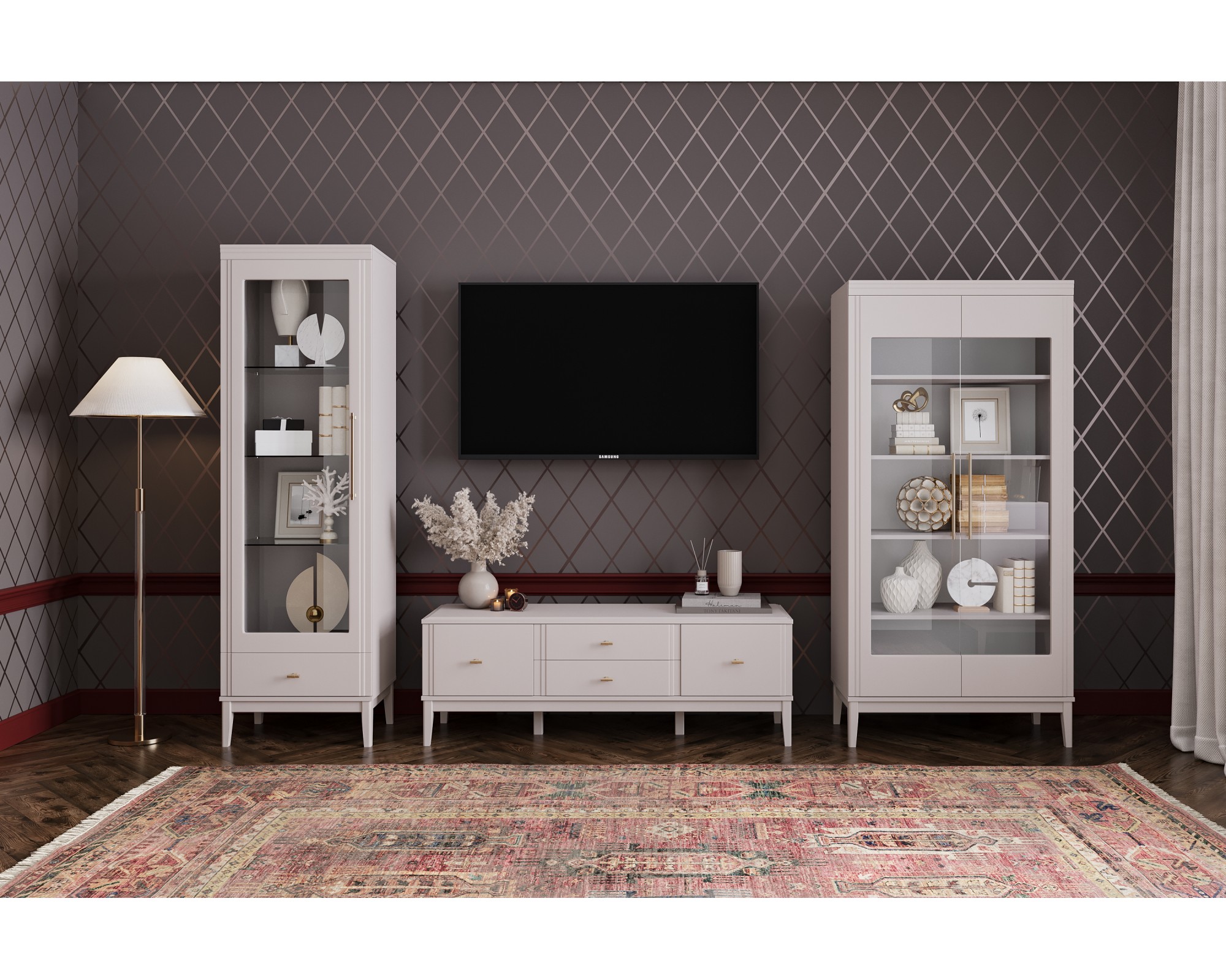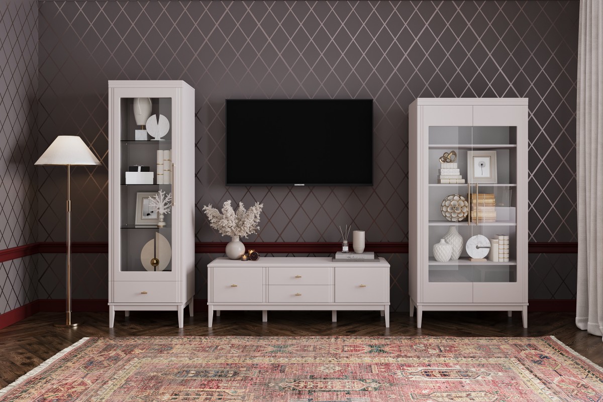 Базовая комплектация модульной гостиной ДЖАЛИ (льняной) может состоять из 1-дверного шкафа-витрины (ШхГхВ: 600 х 440 х 2200 мм) с тремя стеклянными полками (4 мм), 2-дверного шкафа-витрины (ШхГхВ: 890 х 440 х 1860 мм) с четырьмя вместительными вкладными полками из ЛДСП, вместительной тумбы ТВ с двумя выдвижными ящиками на шариковых направляющих полного выдвижения, обеспечивающими легкий доступ к аксессуарам, пультам и документам и двумя отделения с распашными дверцами, которые позволят аккуратно скрыть от глаз технику и крупные предметы (ШхГхВ - 1466 х 440 х 526 мм).