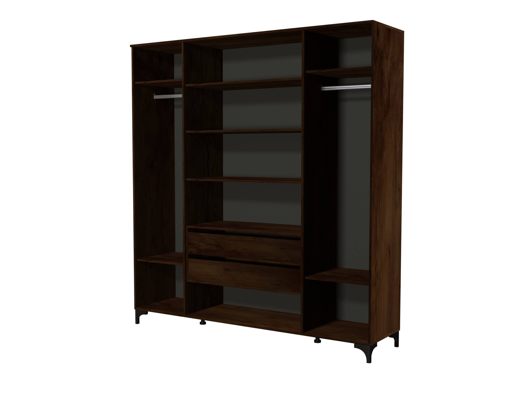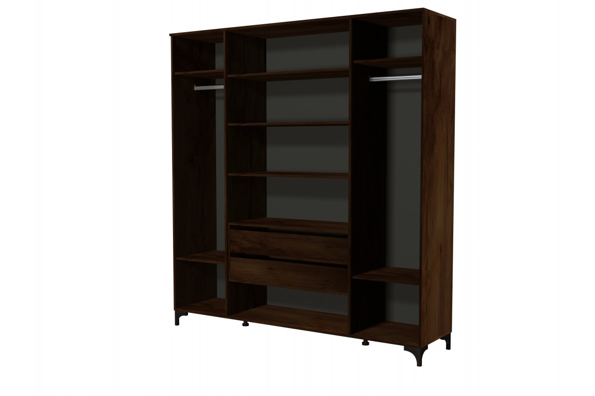 Размеры ШхГхВ мм - 2002х520х2167 мм. Корпус ЛДСП, фасад МДФ. Шкаф с фрезерованными фасадами имеет три секции. За левой и правой расположены секции со штангой и полками. Посередине, за центральными дверьми, располагаются четыре полки для белья, а также два выдвижных ящика. Петли с доводчиками, шариковые направляющие полного выдвижения.