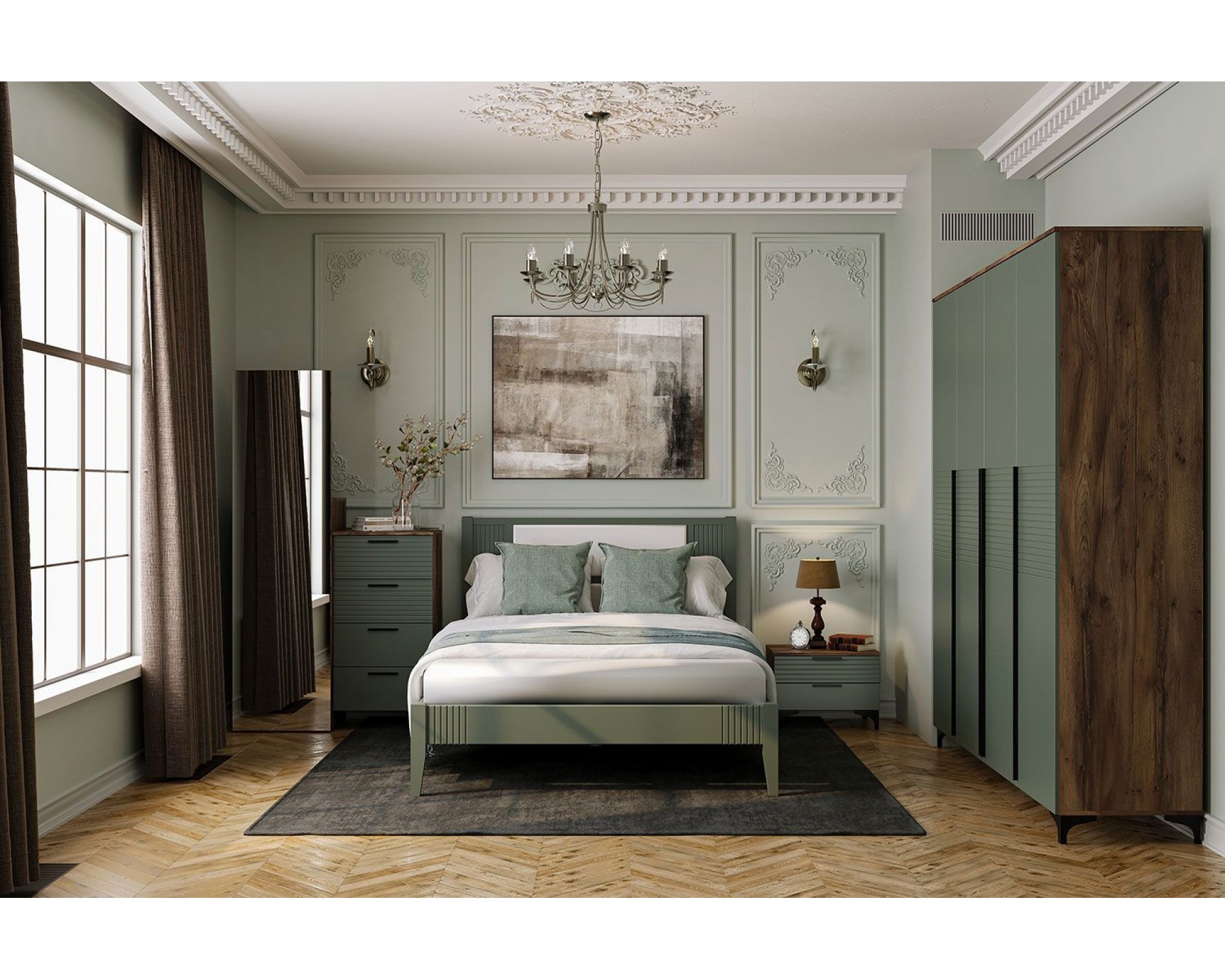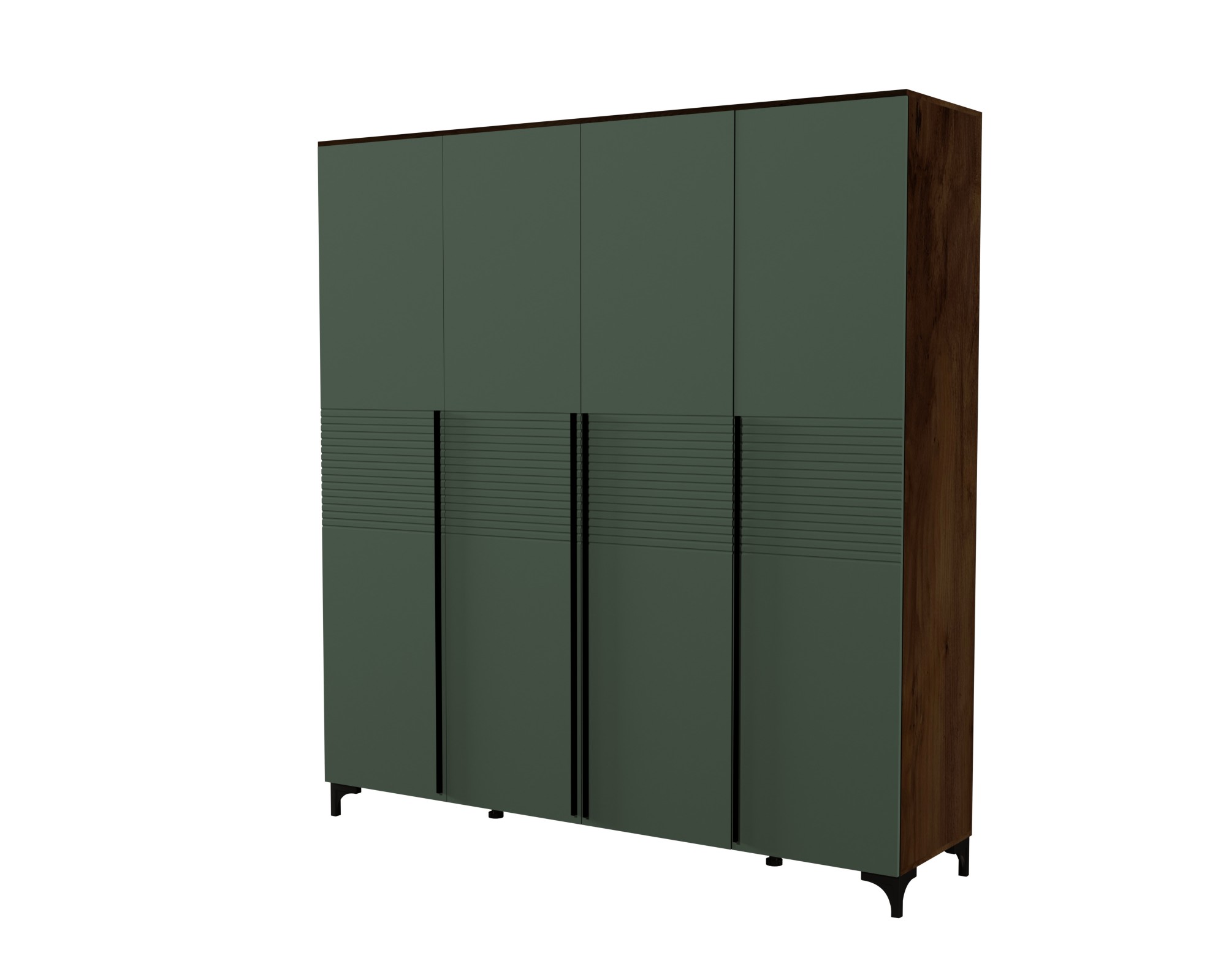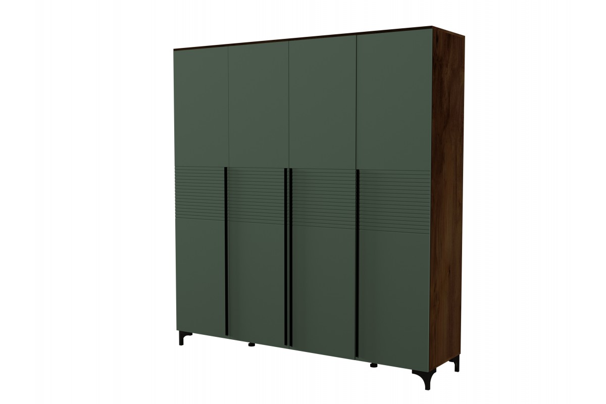 Шкаф распашной четырехстворчатый является элементом спального гарнитура "Брента" в цвете оливковый, новинки современной коллекции мебели БРАВОмебель. Строгие линии форм, сочетание гладкости и фрезеровки фасадов, изящные опоры делают мебель данной коллекции элегантной и уютной.