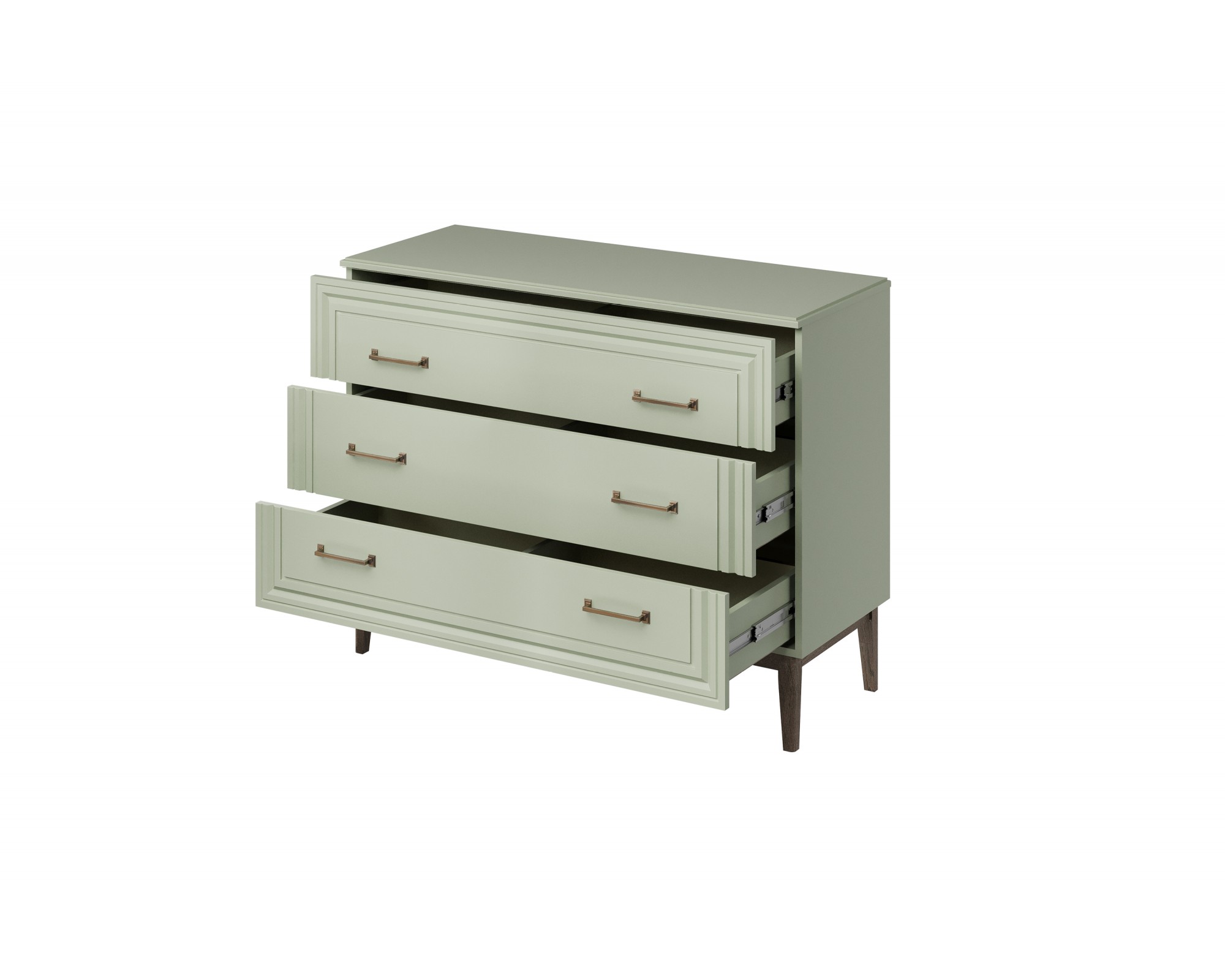 Базовая комплектация спальни ГОРИЦИЯ  в цвете "зеленый самшит" может состоять из распашного четырехдверного шкафа (ШхГхВ - 2014х525х2197 мм), вместительного комода с тремя выдвижными ящиками (ШхГхВ - 1175х958х910 мм) и двух прикроватных тумбочек (ШхГхВ - 554х405х459 мм).
