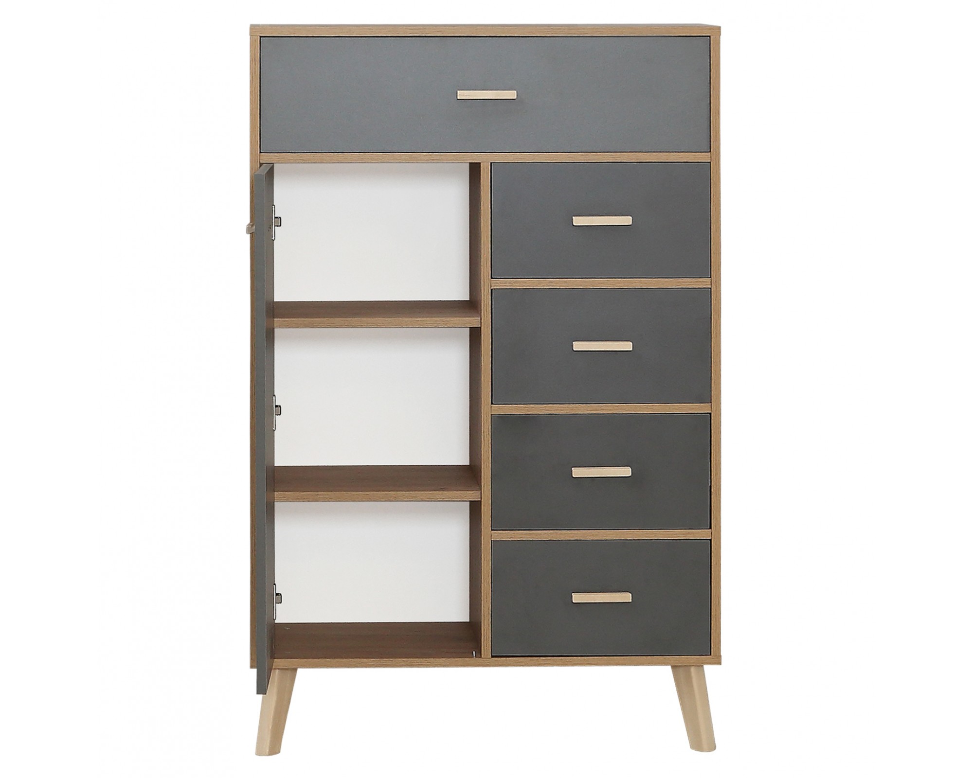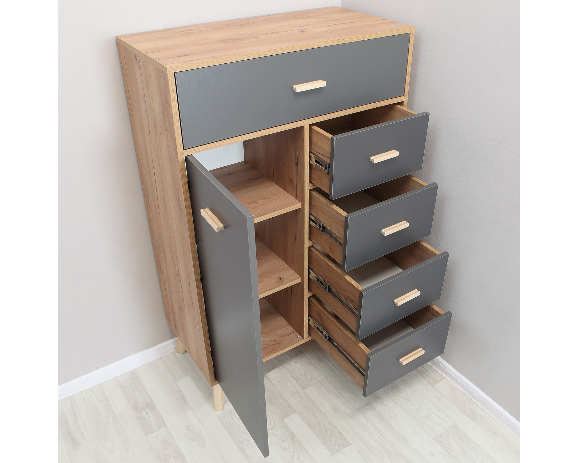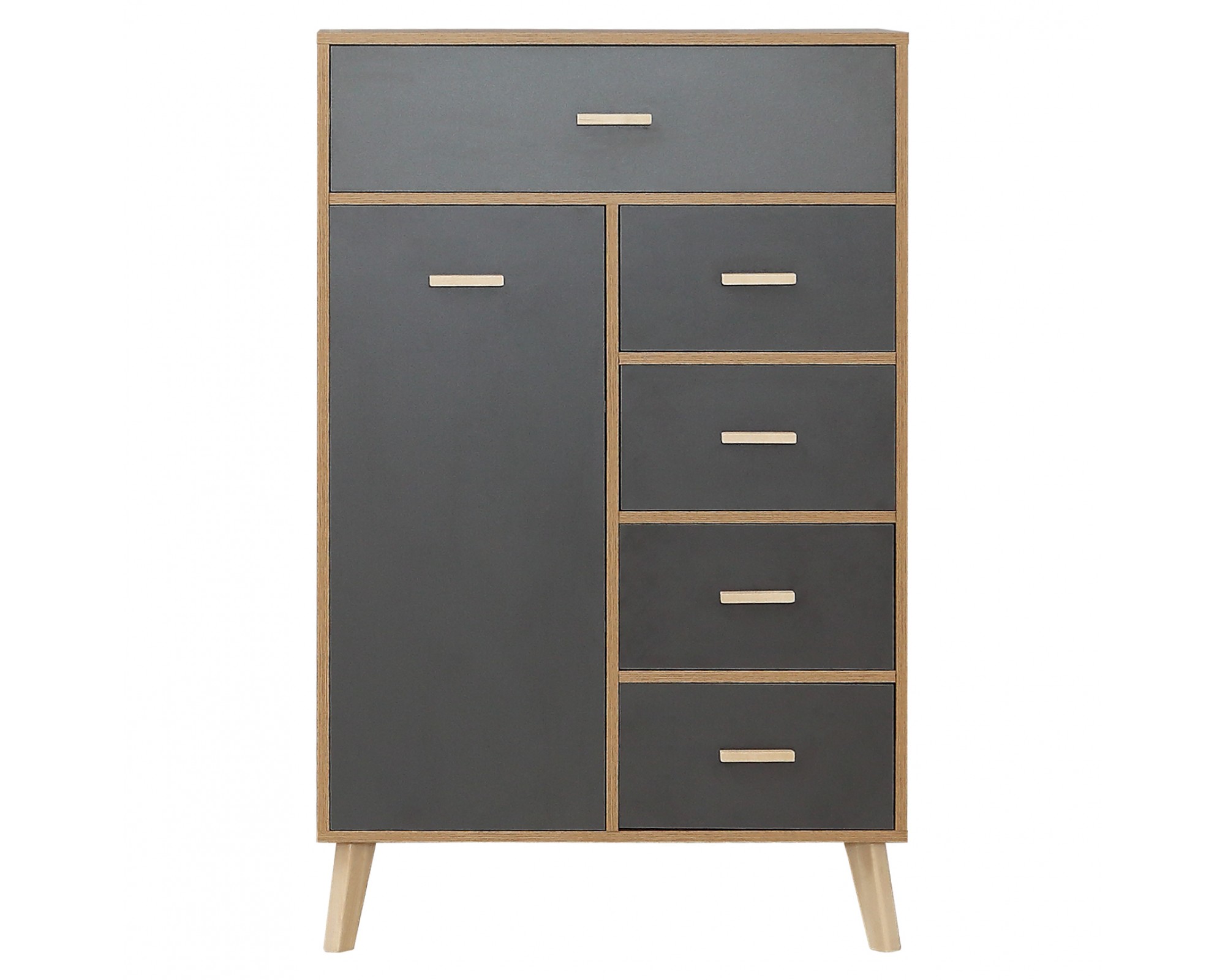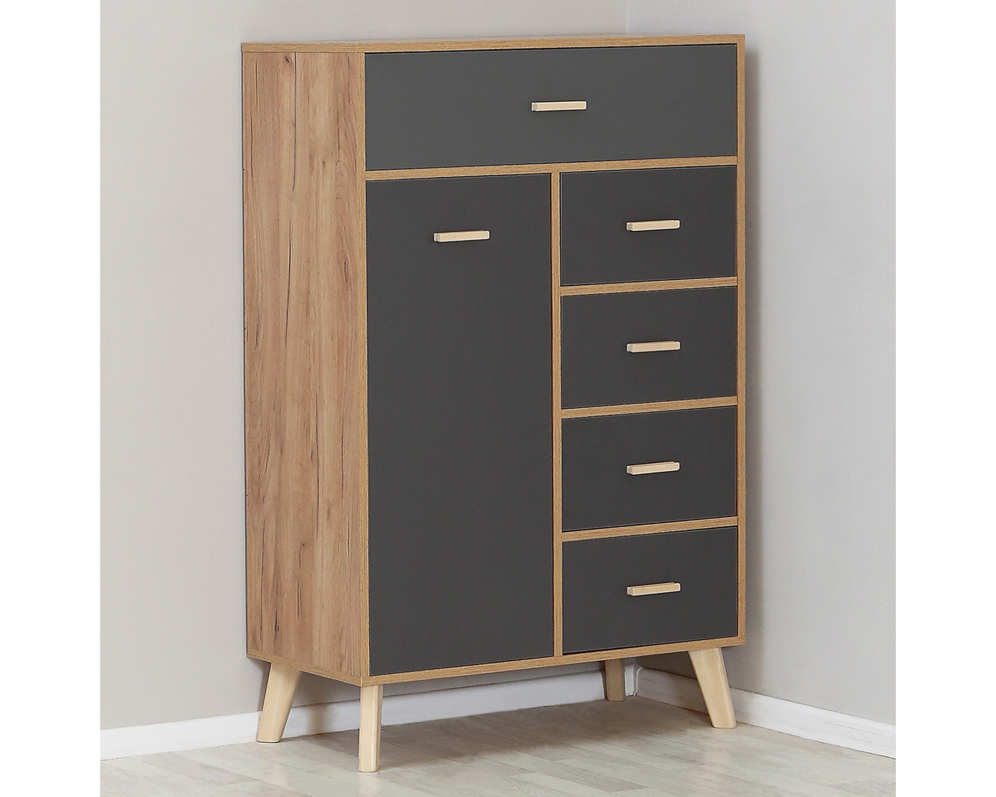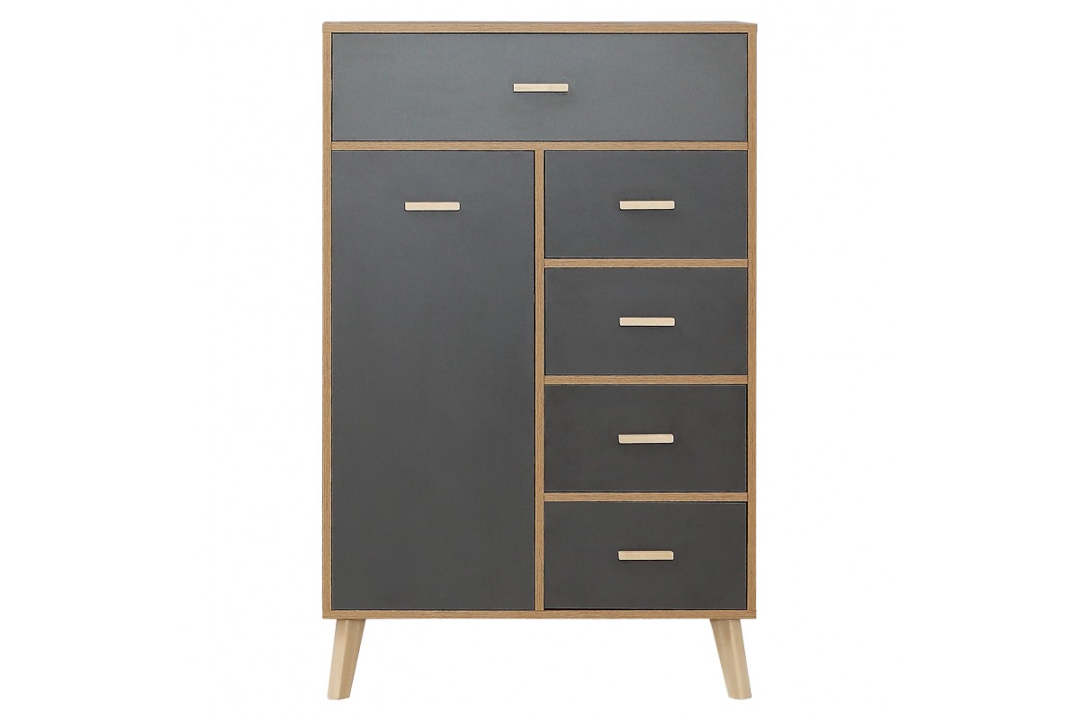 Лаконичный скандинавский дизайн комода Скандик-3 будет уместен в гостиной, спальне и комнате подростка. Комод высотой 125,6 см и шириной 80 см с пятью выдвижными ящиками на телескопических направляющих и одной дверцей является элементом модульной коллекции Скандик-3 фабрики мебели Элегия (РФ) в цветах графит серый (фасады) и дуб крафт золотой (корпус). Фасады ящиков и дверцы вкладные, то есть находятся в обрамлении корпуса, а значит выгодно подчеркивают контраст цветов комода. Опоры и ручки выполнены из массива березы и покрыты экологически чистым бесцветным лаком на водной основе.
