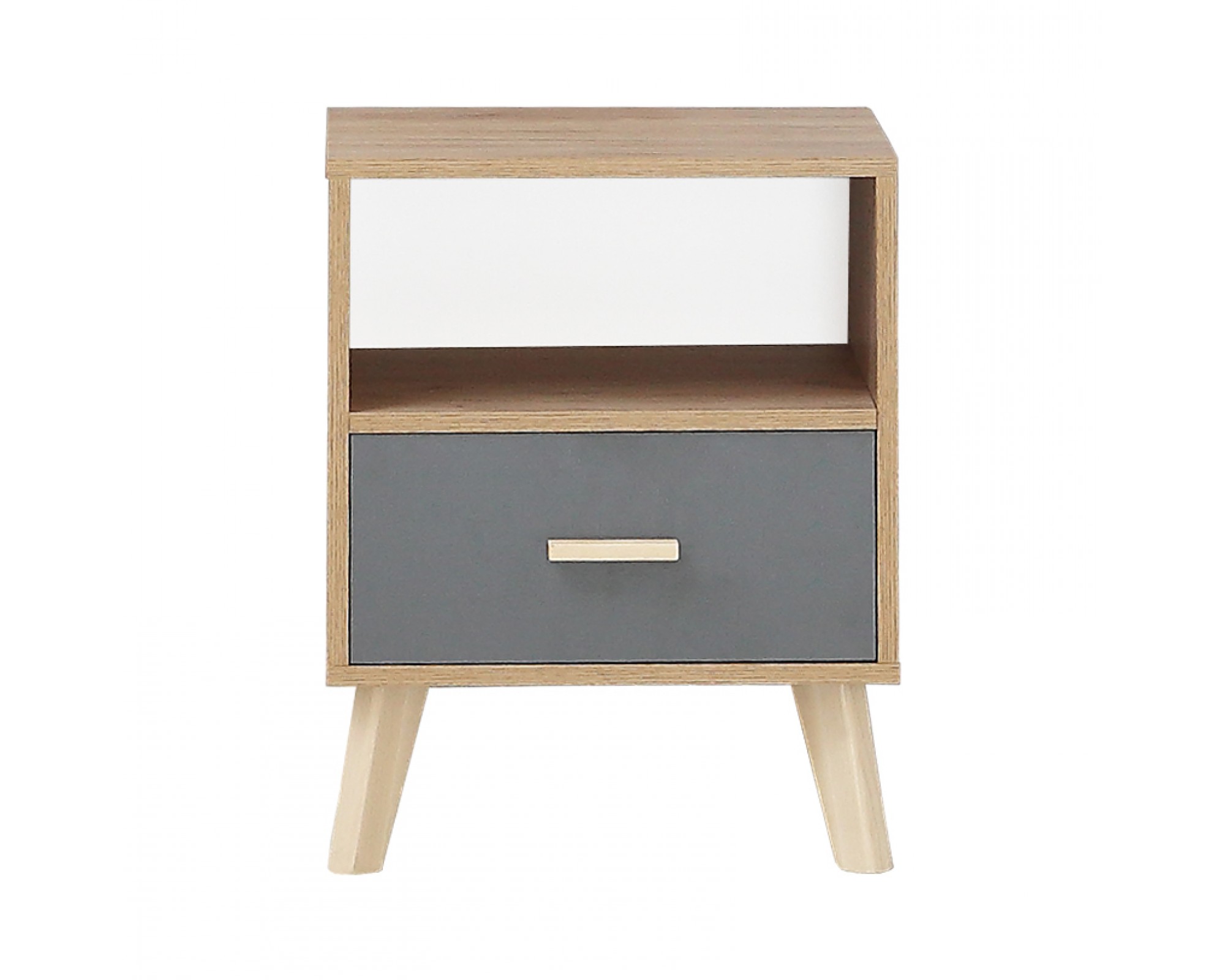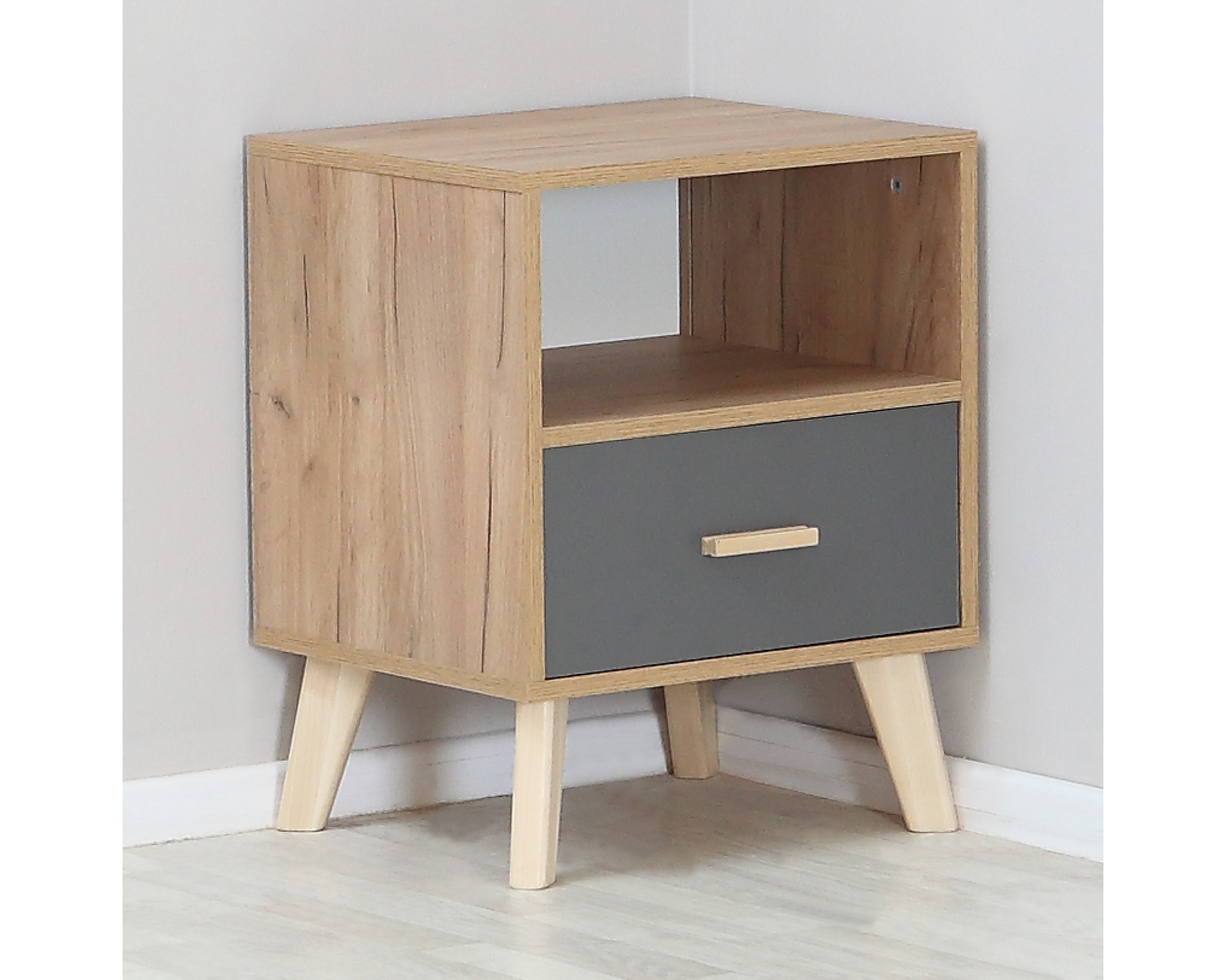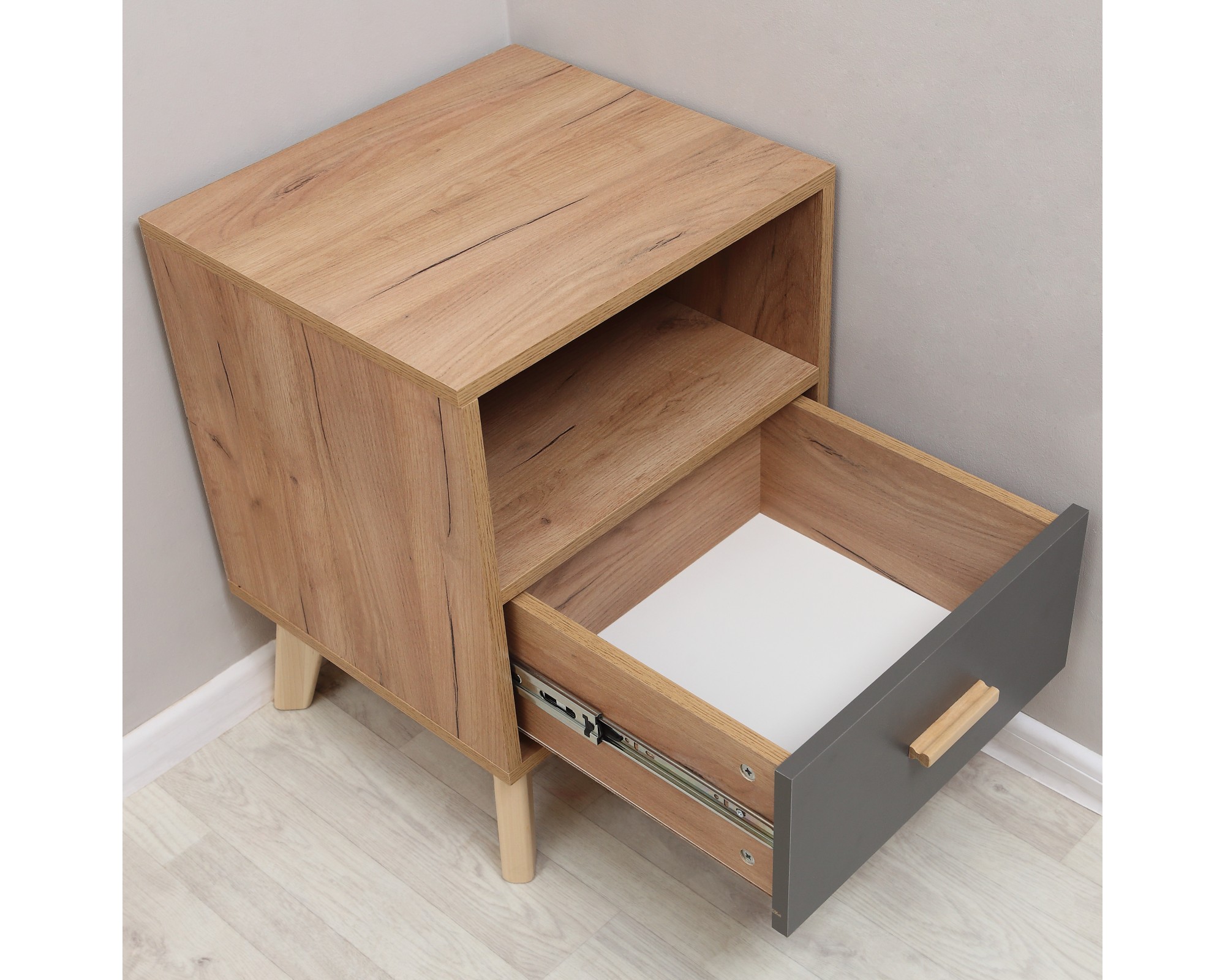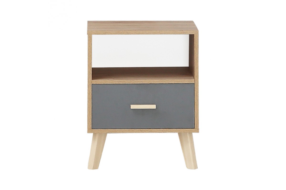 Лаконичный скандинавский дизайн прикроватной тумбочки Скандик-3 будет уместен и в спальне и комнате подростка. Тумба прикроватная высотой 57 см и шириной 44 см с выдвижным ящиком на телескопических направляющих и открытой полкой является элементом модульной коллекции Скандик-3 от фабрики мебели Элегия (РФ) в цветах графит серый (фасад) и дуб крафт золотой (корпус). Фасад ящика вкладной, то есть находится в обрамлении корпуса, а значит выгодно подчеркивают контраст цветов прикроватной тумбы. Опоры и ручка выполнены из массива березы и покрыты экологически чистым бесцветным лаком на водной основе.