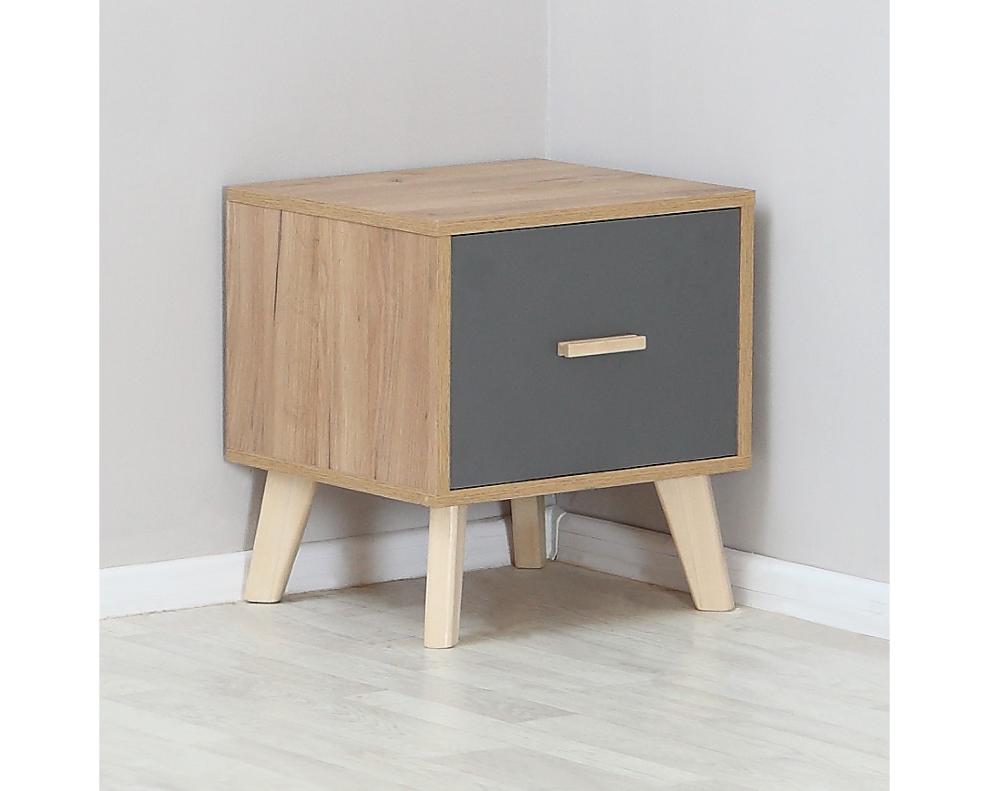 Модули коллекции Скандик-3 - трехдверный распашной шкаф ШР-3, комод с 3-мя ящиками и 1-й дверью шириной 80 см, тумба прикроватная с ящиком и кровать Эльза в цвете SAVANA PLUS GRAFIT спальным местом 140 на 200 см.