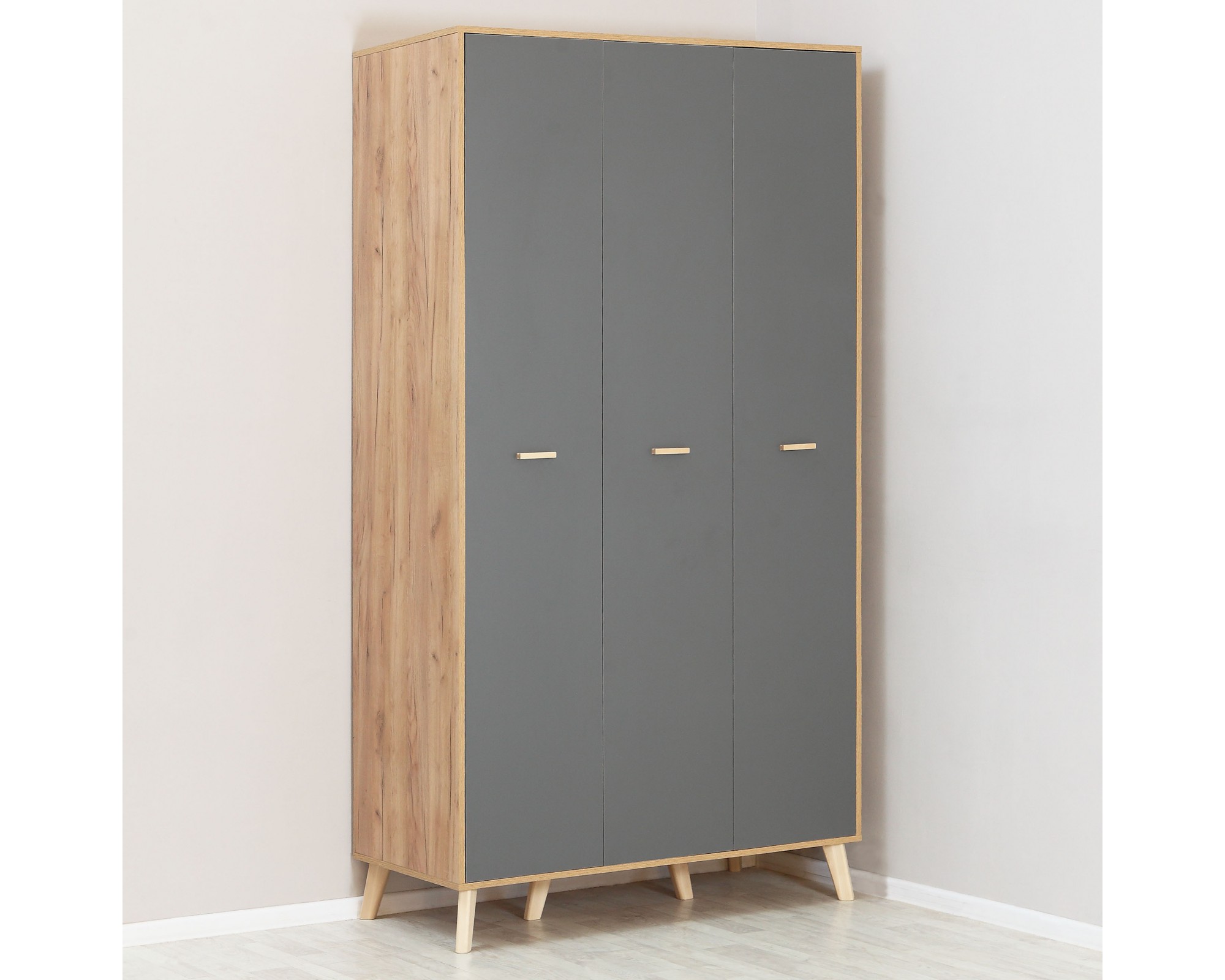 Скандинавская сдержанность модульной спальни СКАНДИК-3 от фабрики Элегия (РФ), выполненной в сочетании цветов серого графита и дуба крафт золотого, в простых прямоугольных формах и высоких ножках элементов мебели этой серии. Один из вариантов модульной спальни Скандик-3 может состоять из трехдверного распашного шкафа ШР-3, комода с 3-мя ящиками и 1-й дверью шириной 80 см, тумбы прикроватной с ящиком и кровати Эльза в цвете SAVANA PLUS GRAFIT спальным местом 140 на 200 см.