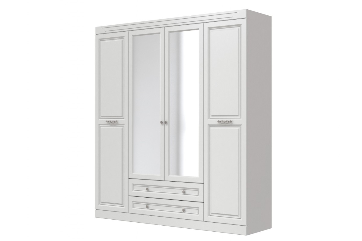 Размеры ШхГхВ - 2012х516х2227 мм. Шкаф изготовлен - корпус - ЛДСП, фасад - МДФ покрытый лаком. Шкаф имеет четыре распашные двери с доводчиками, две центральные двери с зеркалом, под ними располагаются два выдвижных ящика с шариковыми направляющими до полного выдвижения. В шкафу расположены три секции. За левой и правой дверью расположены по четыре полки для одежды и белья. За двумя центральными дверьми расположена секция со штангой и двумя полками. Центральные двери прорезные, с внутренней стороны закреплены зеркала, серебро толщ. 4мм.