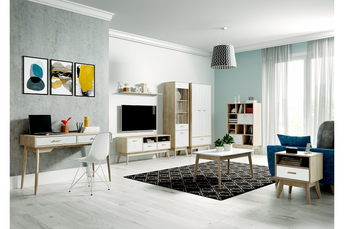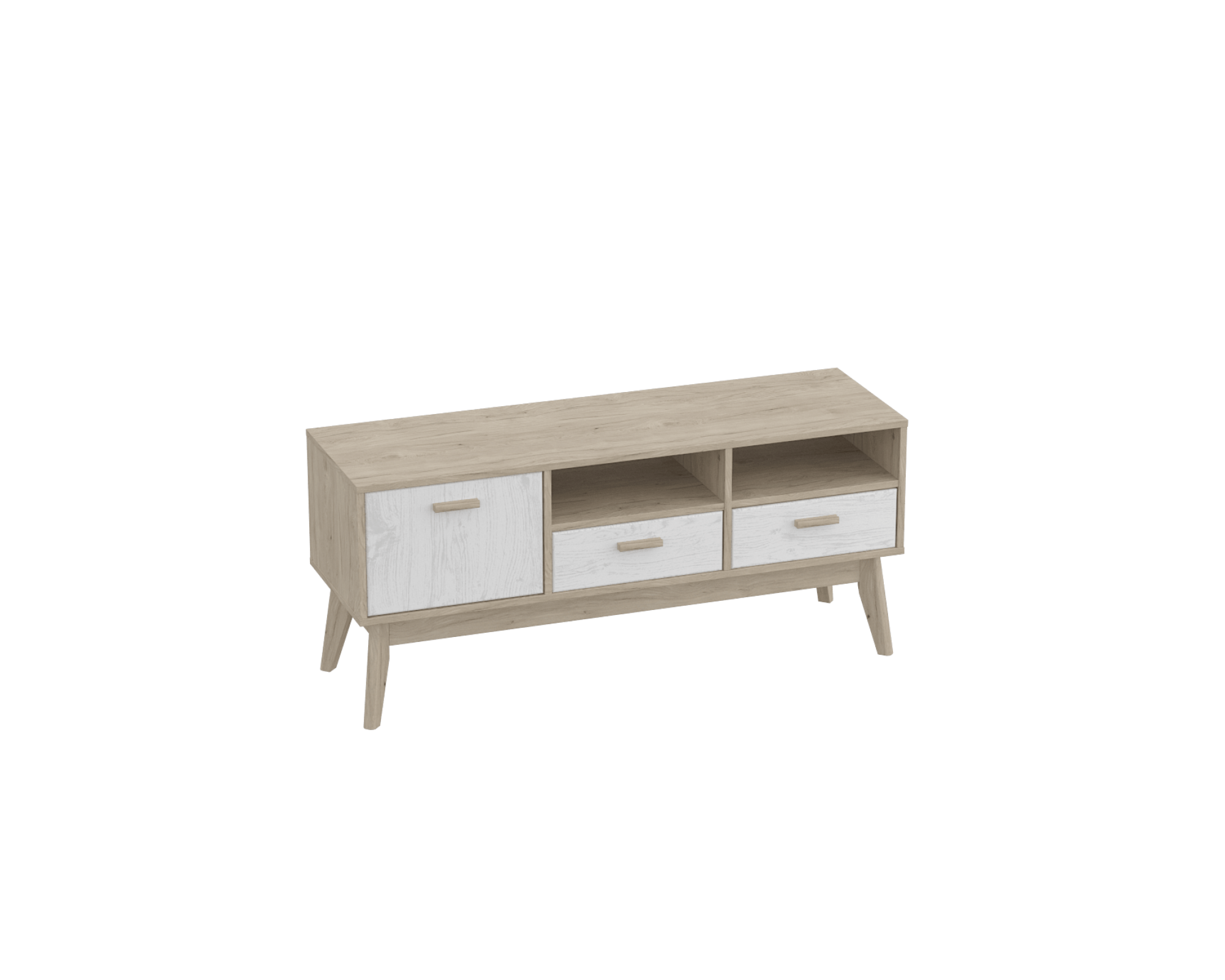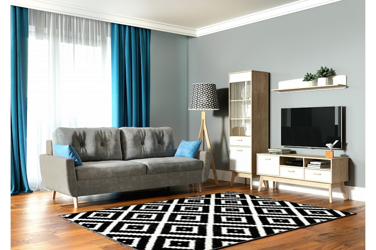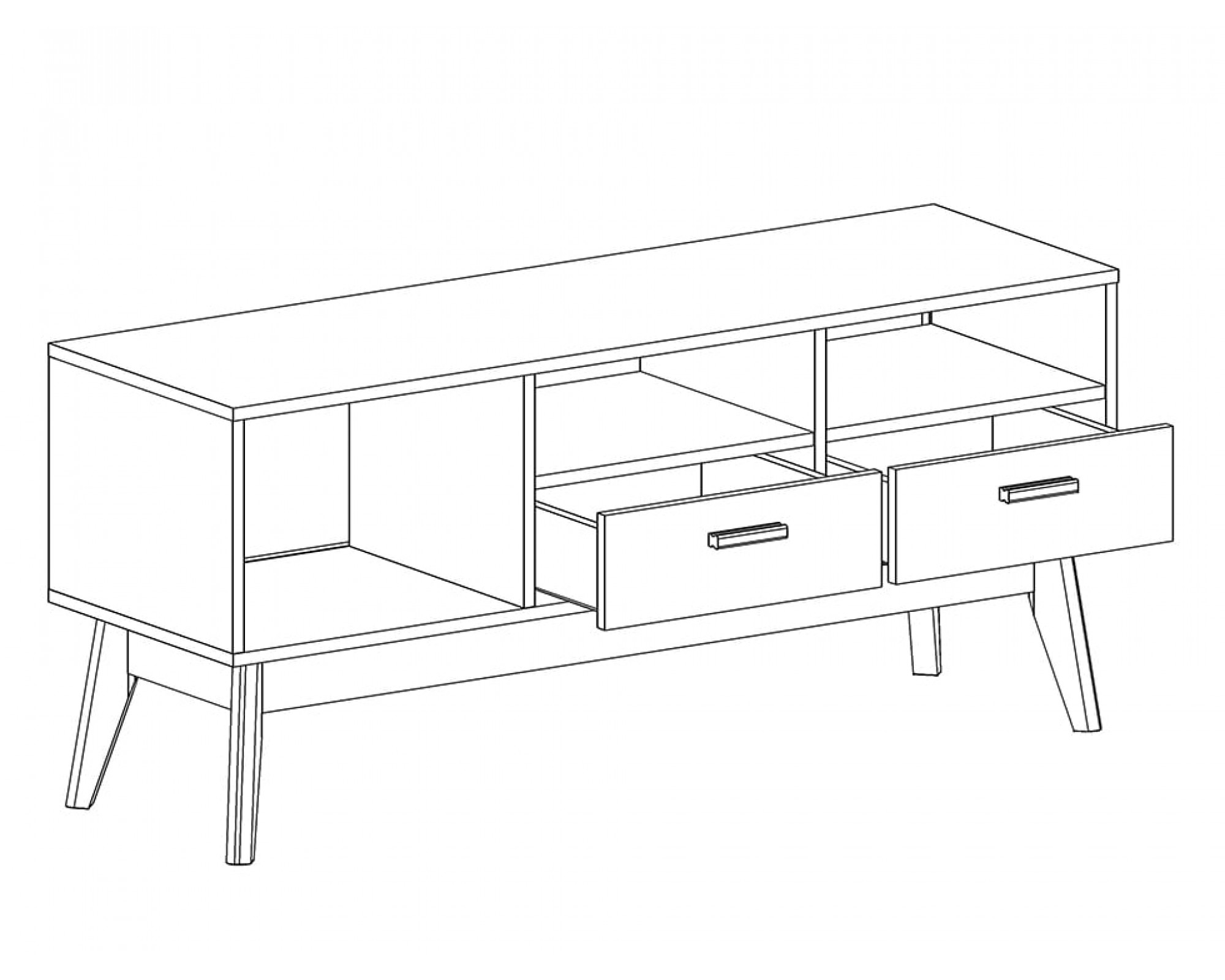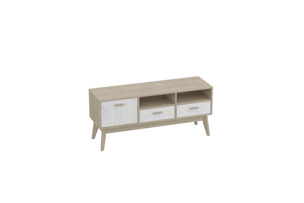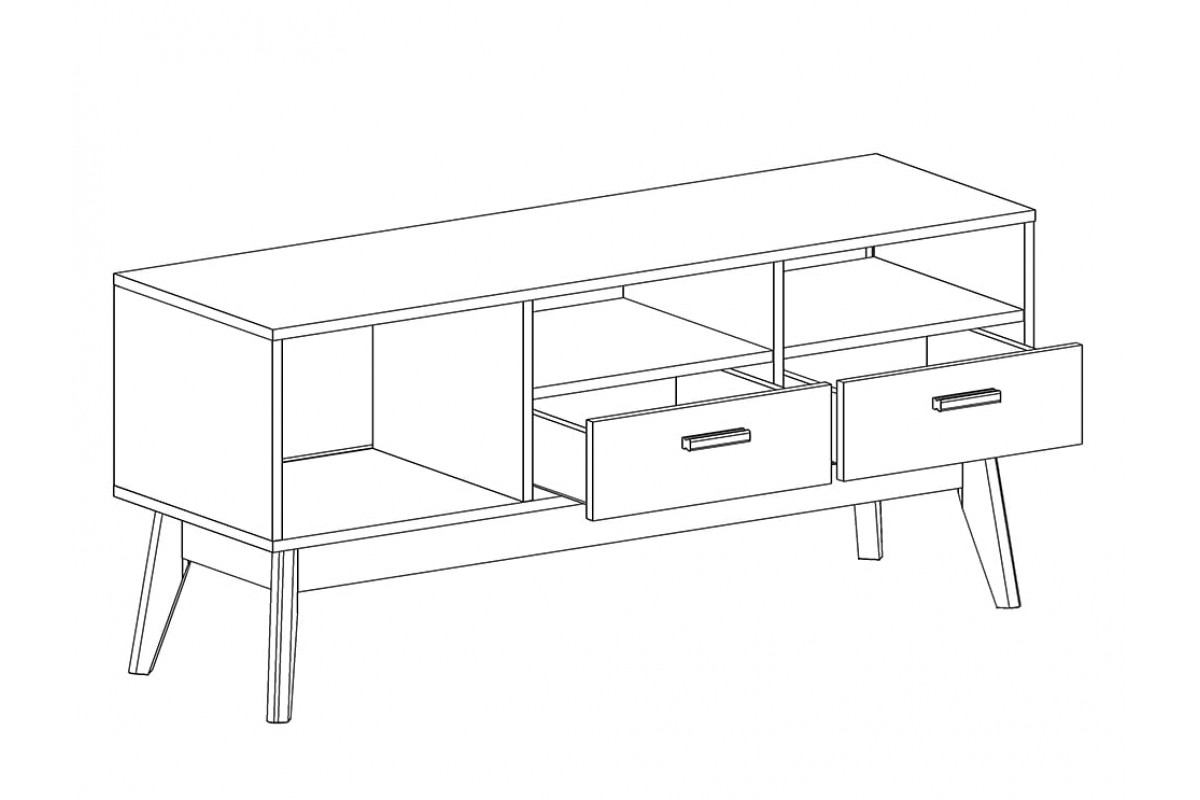 Упорядочить хранение сопутствующих аксессуаров и компонентов домашнего кинотеатра помогут выдвижные ящики с фасадами из белоснежного МДФ, секция с распашной дверцей и открытые ниши. Корпус изделия выполнен из ЛДСП, высокие стильные опоры и ручки - из массива березы.